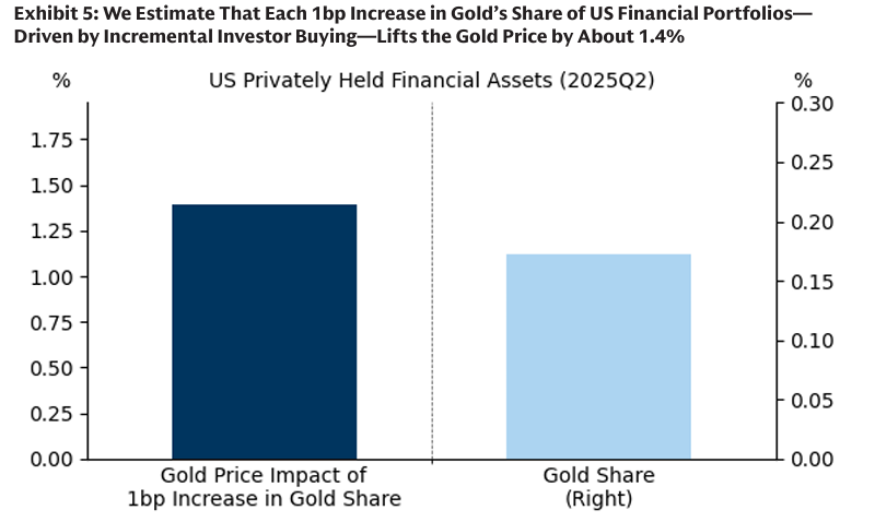 高盛在此次报告中还重申,估计随着投资者的加量购买,美国金融投资组合中黄金份额每增加1个基点,就会使黄金价格上涨1.4%。