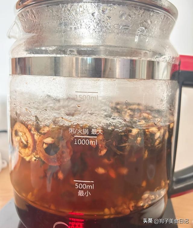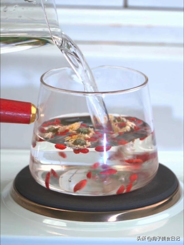 准备几朵干菊花、一小把枸杞,温水冲洗干净,开水冲泡焖5分钟就能喝。